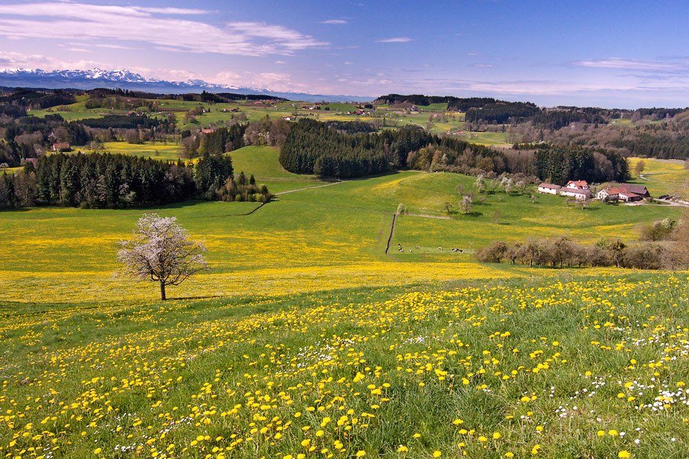 Unser Ferienhof liegt ca. 25 km nördlich vom Bodensee,zwischen Wäldern, Wiesen und Obstbäumen in ruhiger Lage mit einzigartiger Bergsicht am Rande des Deggenhausertals.